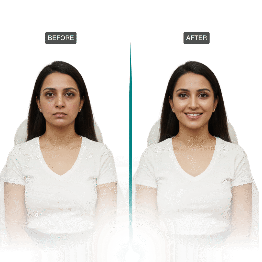 Dark circles often result from fatigue, genetics, or skin thinning. Our under-eye rejuvenation program includes targeted peels, fillers, and laser therapy to brighten and firm the eye area.