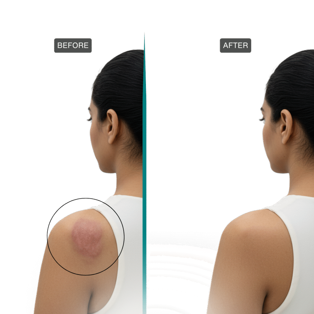 Keloids and raised scars are treated with a combination of laser therapy, corticosteroid injections, and precision dermatological care. Our approach minimizes scar height and color for smoother texture.